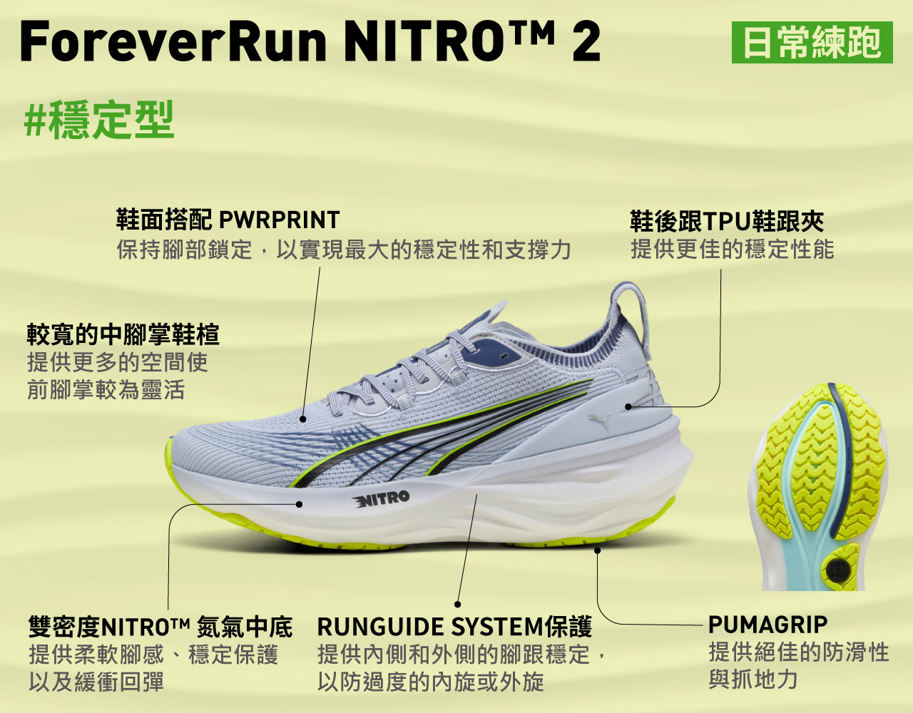 - PUMA ForeverRun NITRO™ 2慢跑鞋為PUMA日常練跑中的穩定型鞋款,具有全方位的RUNGUIDE