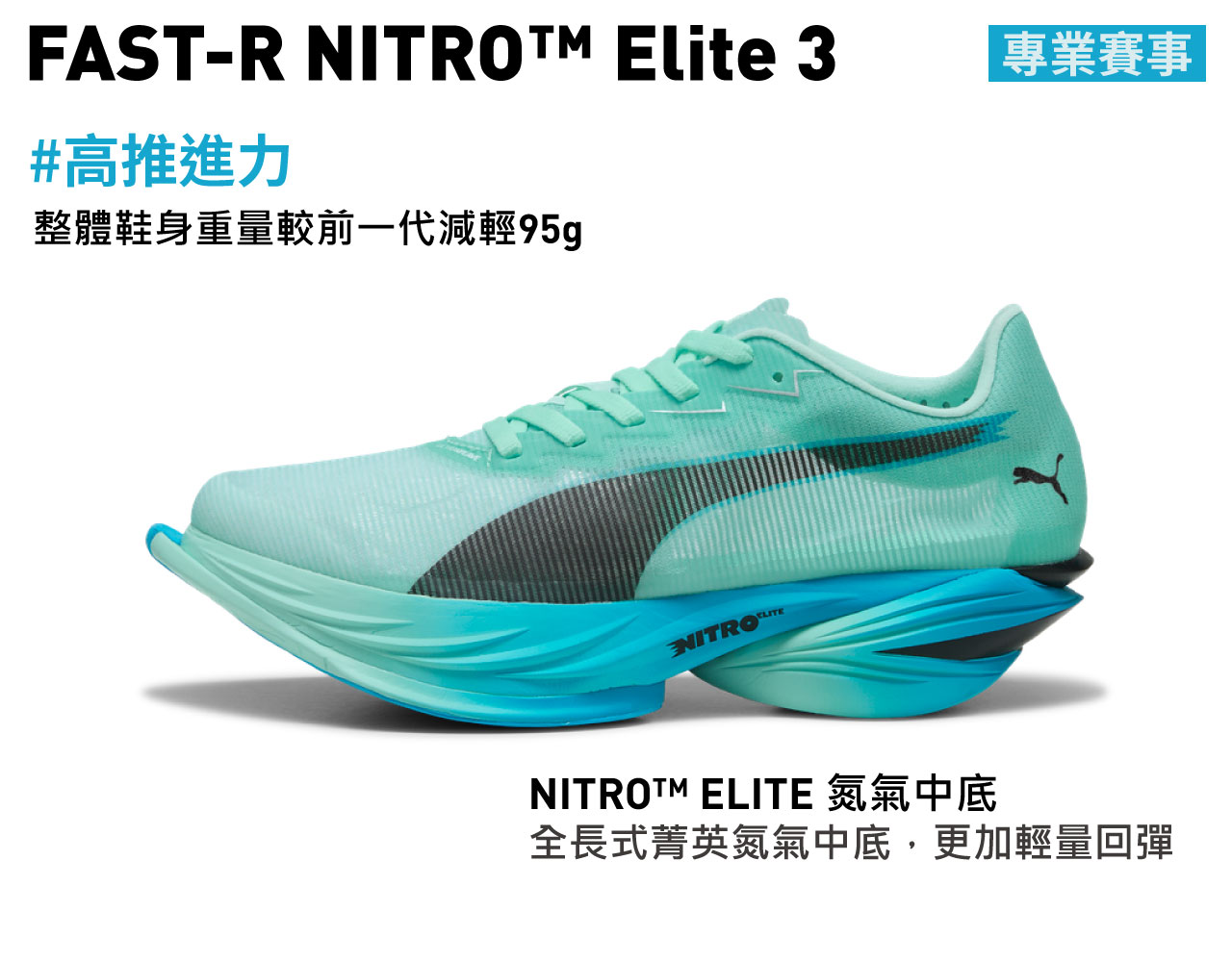 - PUMA FAST-R NITRO™ Elite 3 Wns慢跑鞋專為競速表現打造,搭載 NITROFOAM™ Elite