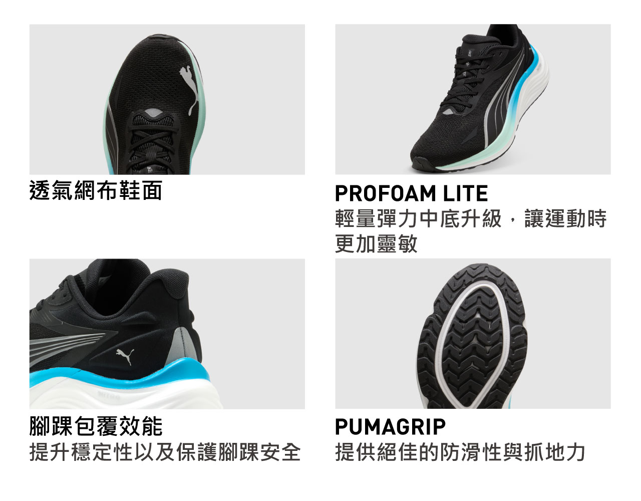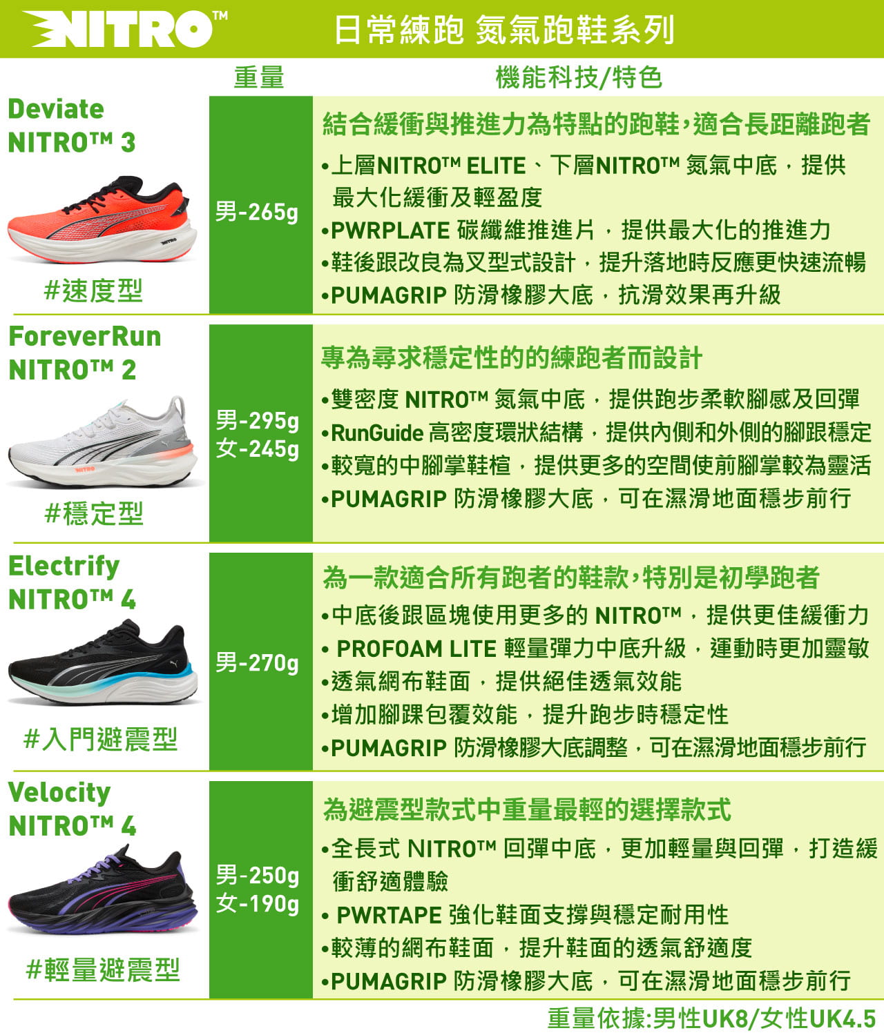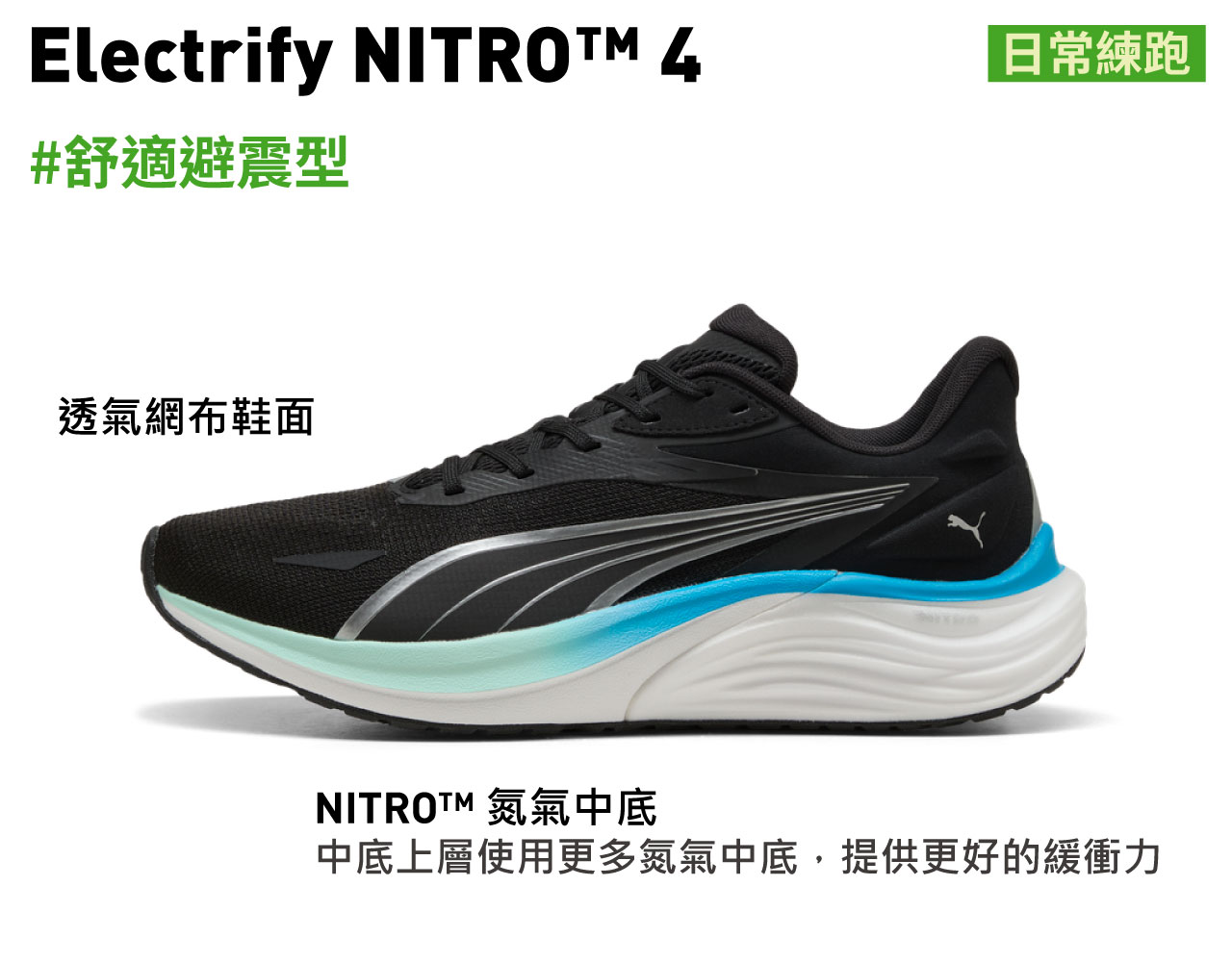 - PUMA Electrify NITRO™ 4慢跑鞋為PUMA日常練跑中的避震型鞋款,中底後跟區塊,比前代使用更多�