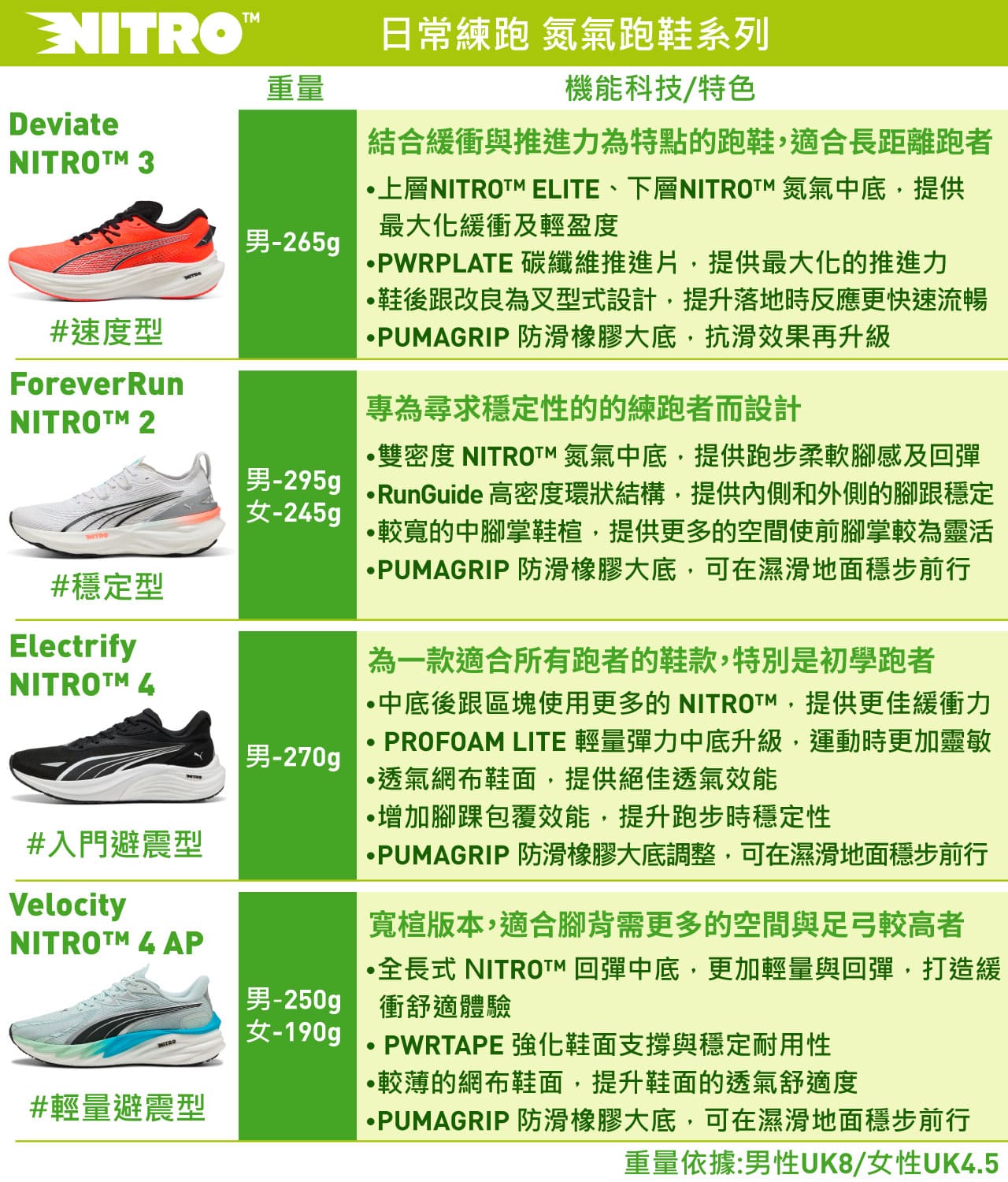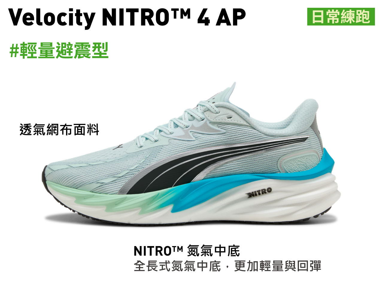 - PUMA Velocity NITRO™ 4 AP 慢跑運動鞋專為不同程度的跑者量身打造,結合優異避震、輕盈腳感�