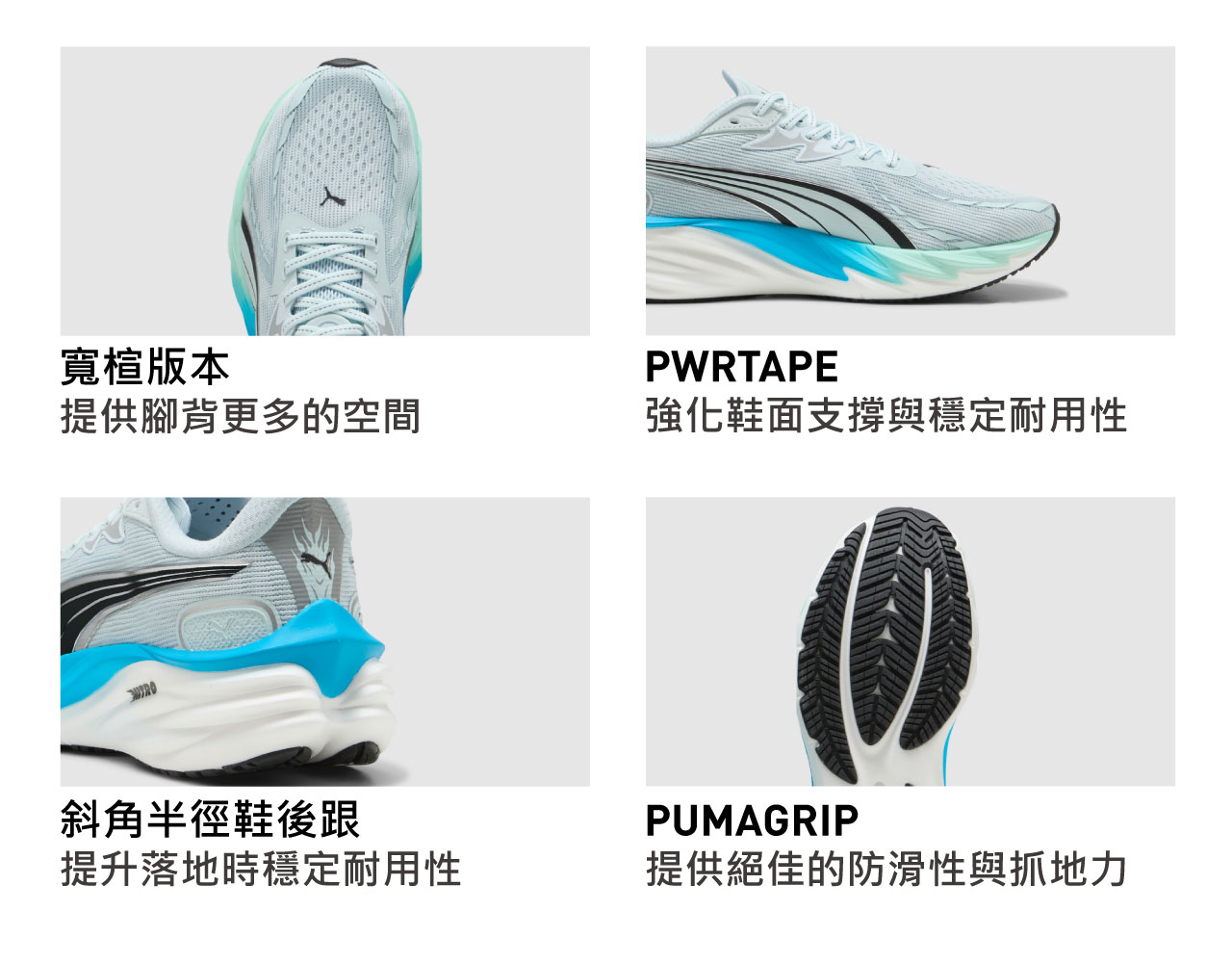 PUMA Velocity NITRO™ 4 AP 慢跑運動鞋專為不同程度的跑者量身打造,結合優異避震、輕盈腳感與全方位舒適度,陪伴跑者從日常訓練到賽事備戰。今年進化登場的第四代版本,打造減輕 14g 的極致輕盈,回彈與透氣性全面升級 。此外,第四代版本更是首度升級採用全長式 NITROFOAM™ 氮氣中底,獻上絕佳能量回彈,打造更優異的緩衝與跑步效率;鞋後跟特別採用斜角半徑設計,增強落地時的穩定性與耐用度;鞋面則升級透氣鞋面,選用較薄的工程網布,提升前腳掌貼合度與透氣性,並結合 PWRTAPE 強化支撐與耐用性;搭配 PUMAGRIP 防滑橡膠大底,提供全方位路面優異的抓地力,讓跑者無論面對城市街道或潮濕環境,都能保持流暢步態與穩健配速。而AP 亞洲寬楦版本,特別適合需要更多腳背空間或足弓較高的跑者,讓包覆感與舒適度再升級。