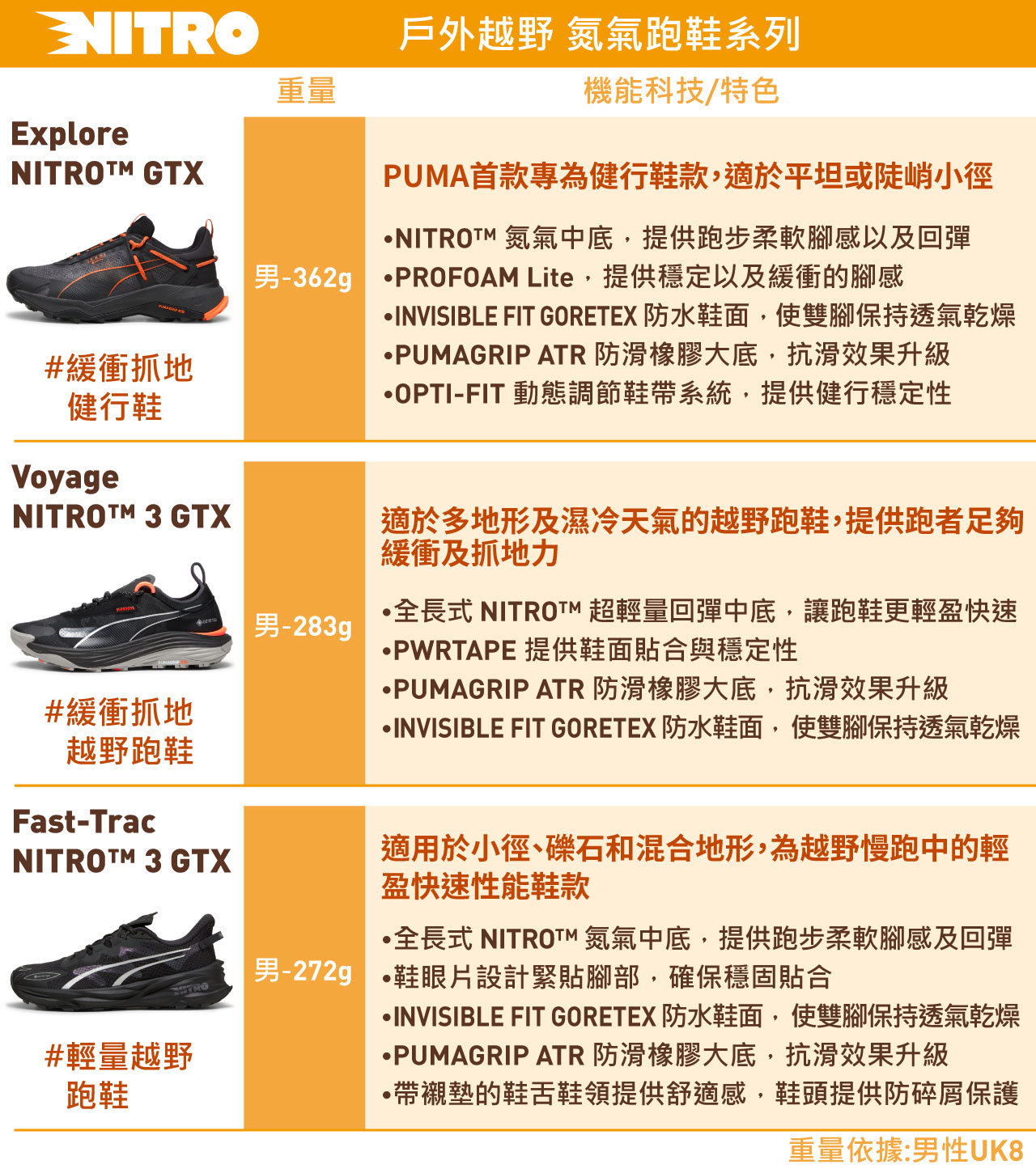 - PUMA Voyage NITRO™ 3 GTX慢跑鞋是避震良好的健行跑鞋,讓您以舒適和時尚的方式應對任何地形�