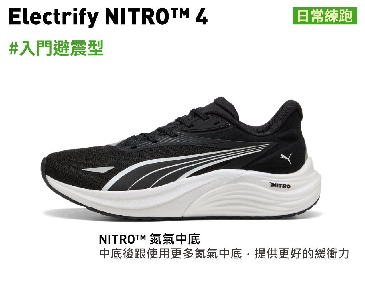 - PUMA Electrify NITRO™ 4慢跑鞋為PUMA日常練跑中的避震型鞋款,中底後跟區塊,比前代使用更多�