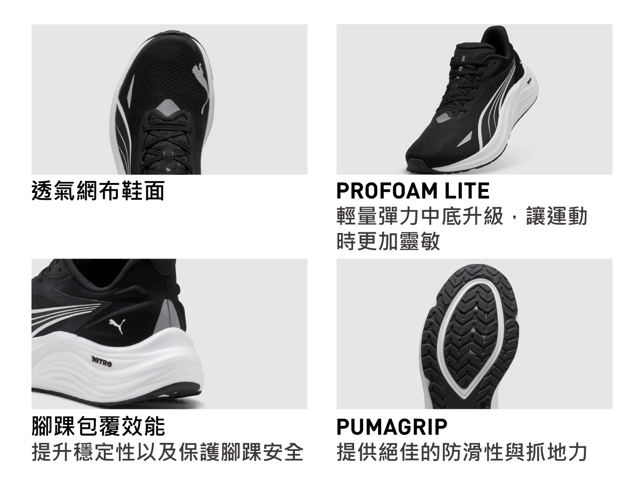 PUMA Electrify NITRO™ 4慢跑鞋為PUMA日常練跑中的避震型鞋款,中底後跟區塊,比前代使用更多的NITRO™,提供回饋、緩衝力以及腳感享受再提升。PROFOAM LITE 輕量彈力中底也再升級,其高回彈特性,提供運動時絕佳的腳感,讓移動時更加靈敏,而PUMAGRIP 防滑橡膠大底區塊的調整,提供絕佳的防滑性與抓地力。透氣網布鞋面,可提供絕佳透氣效能,此鞋款也增加跑步時腳踝包覆效能,提升穩定性以及保護腳踝安全。