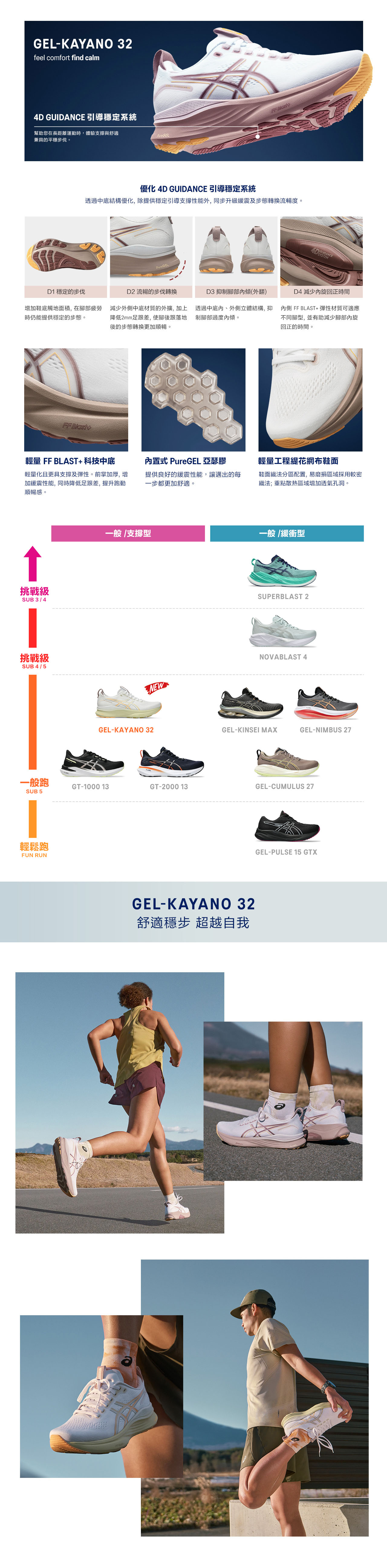 - •GEL-KAYANO 32系列,透過增加腳尖厚度降低足跟差,減少跟腱負擔,讓跑者感受更自然的步�