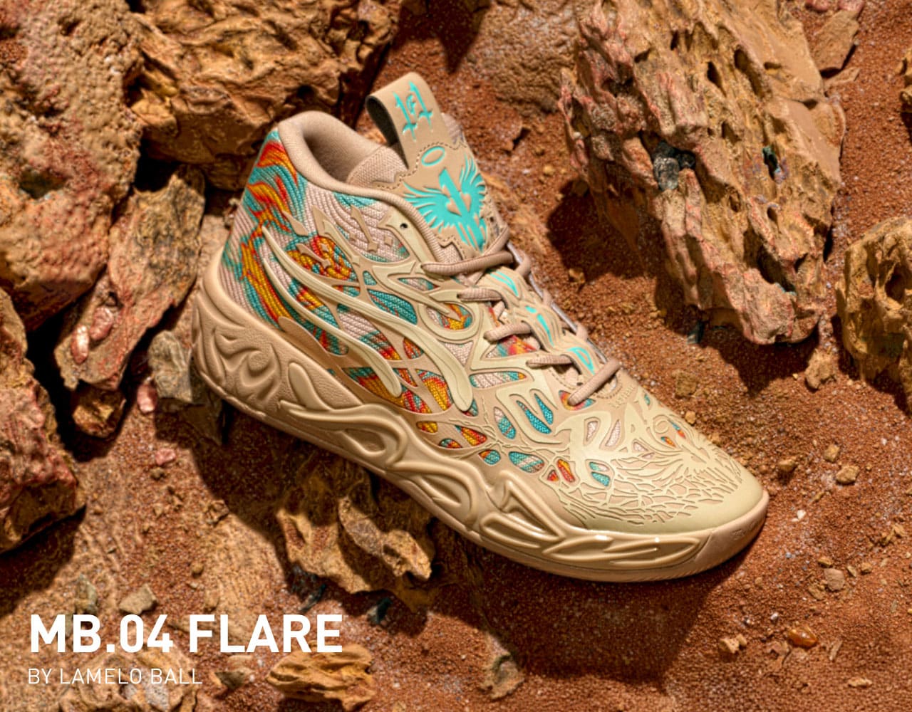 PUMA MB.04 Flare籃球鞋的設計靈感源自 Melo 的比賽風格,鞋面採用全覆式外星紋理設計,並以 Melo 招牌的 Wings 標誌 環繞後跟。這款鞋款採用透氣且支撐性極佳的雙層網眼布料,並搭配NITRO氮氣科技中底,為賽場提供強勁動力。