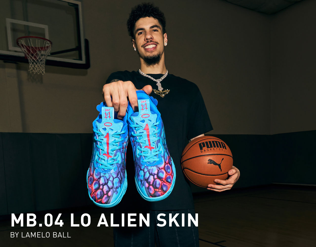 PUMA MB.04 Lo Alien Skins籃球鞋的獨特設計採用外星人紋理包裹而成,Melo 翼形標誌環繞於鞋跟周圍。MB.04 擁有支撐性雙層網眼布鞋面和 NITROFOAM™ 緩衝鞋墊,提供場上所需的各種力量。