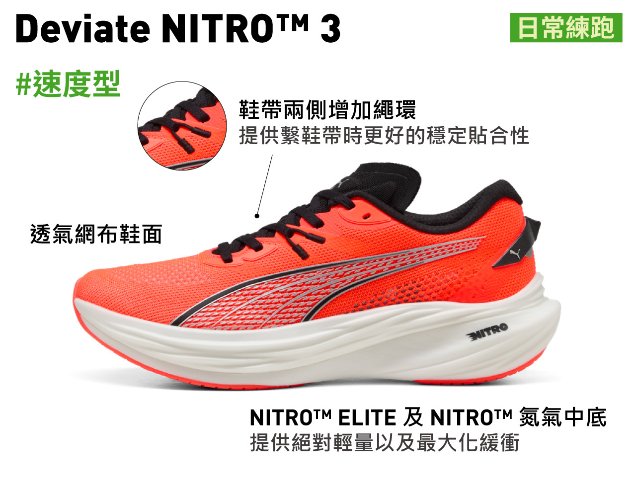 - PUMA Deviate NITRO™ 3 慢跑鞋為PUMA日常練跑中的速度型鞋款,結合緩衝與推進力,適合長距離�