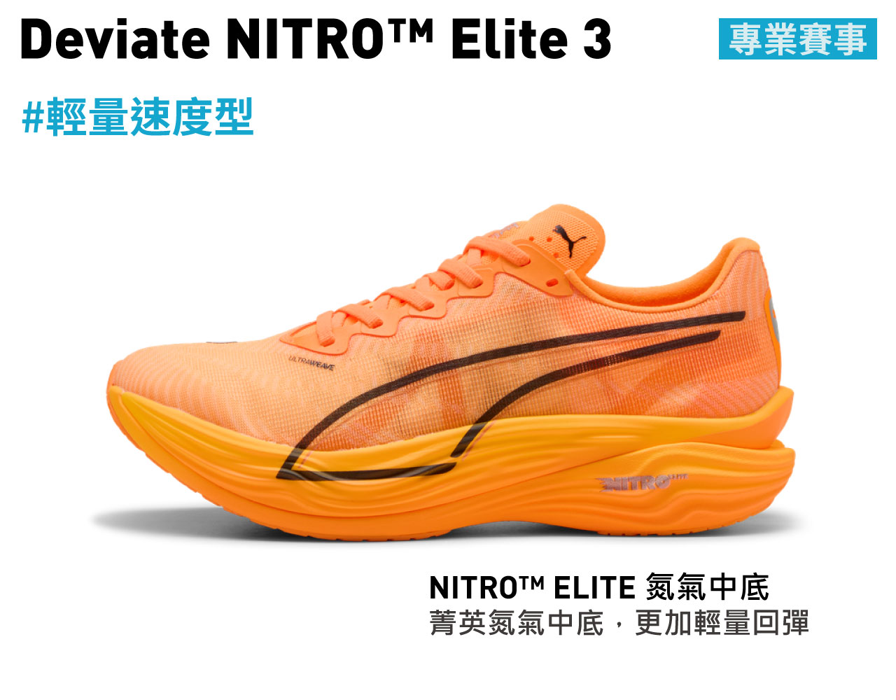 - PUMA Deviate NITRO™ Elite 3慢跑鞋是一款為輕量級競速賽而設計的跑鞋,專為流暢步伐與高步頻�