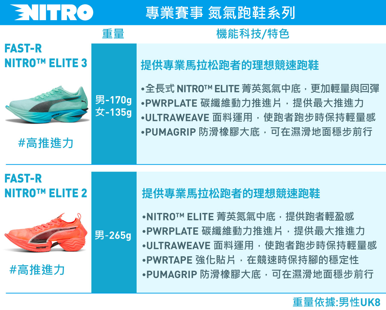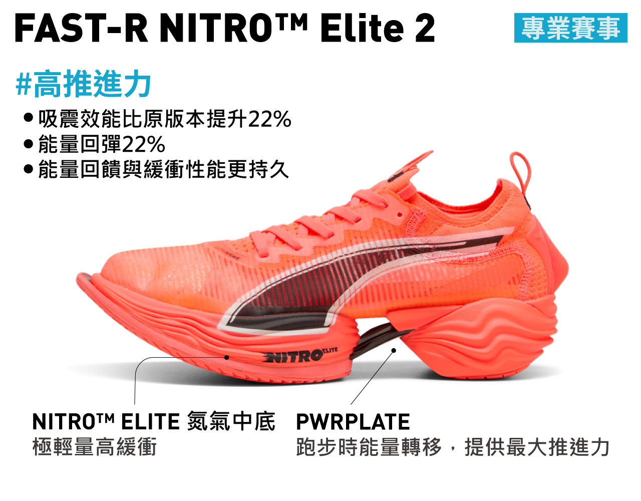- PUMA FAST-R NITRO™ Elite 2慢跑鞋採用增強型 NITRO™ ELITE 和 PWRPLATE