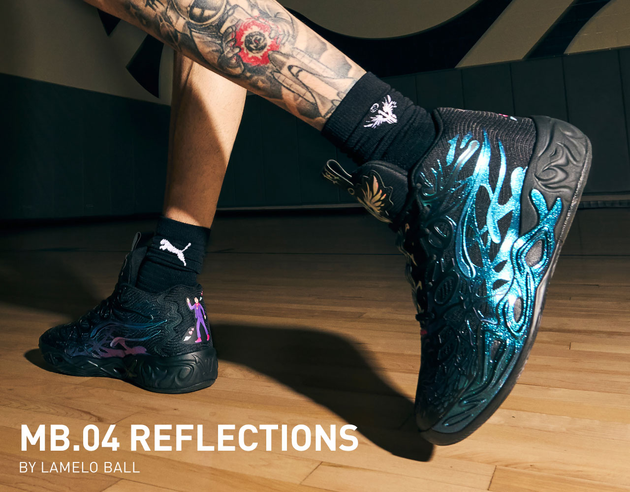 PUMA MB.04 Reflections籃球鞋使用支撐性雙層網眼布鞋面和融合NITRO氮氣科技的中底,提供絕對輕量以及最大化的緩衝。 Reflections 配色採用黑色鞋面,充滿反光細節,並在鞋跟加上專屬的「disco Melo」表情符號。