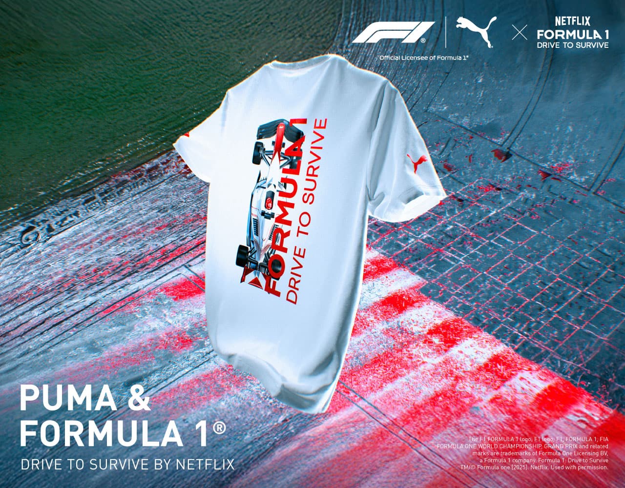 - PUMA Formula 1系列DTS Race圖樣短袖T恤採用正版的 Drive to Survive 圖案、經典圓領以及醒目的 F1®