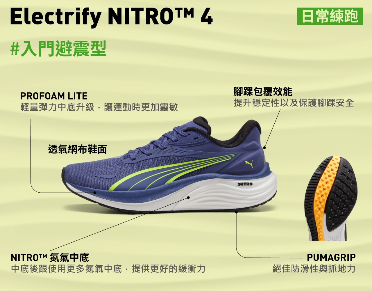 - PUMA Electrify NITRO™ 4慢跑鞋為PUMA日常練跑中的避震型鞋款,中底後跟區塊,比前代使用更多�